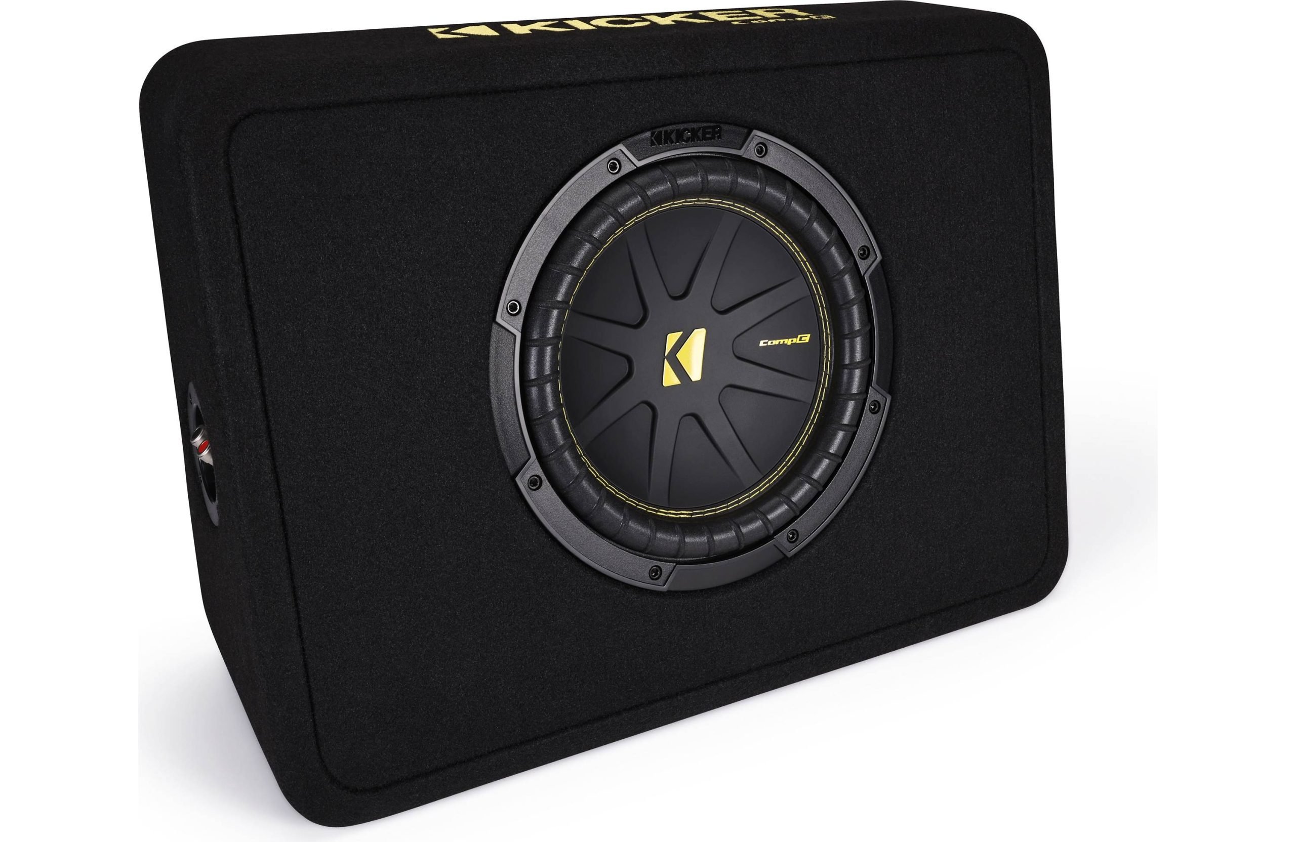 The KICKER® CompC™ Loaded Enclosures include a custom port to optimize subwoofer performance. Thick black carpet and the emblazoned logo make this sub box a perfect choice for an easy install that looks as good as it sounds.